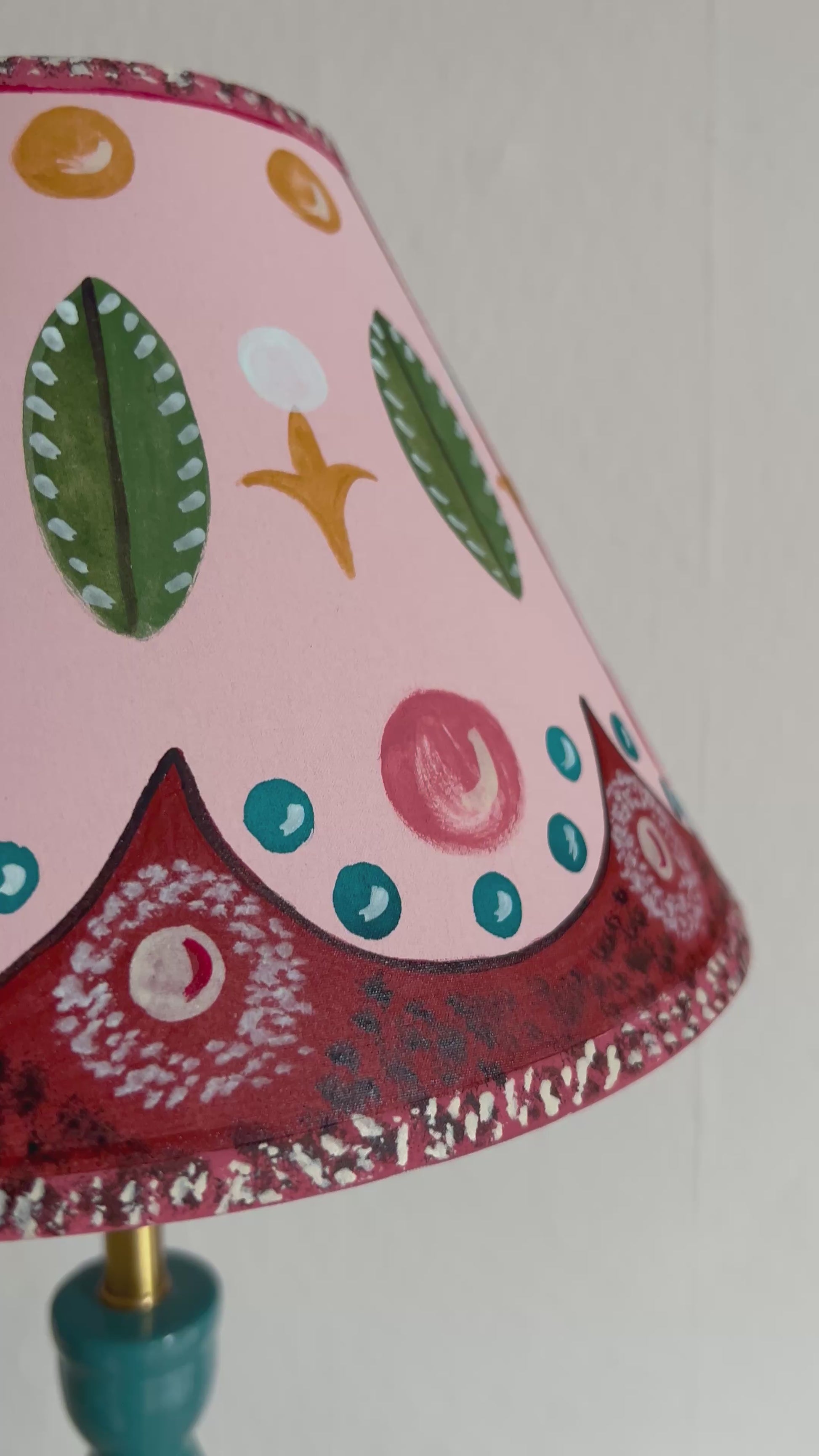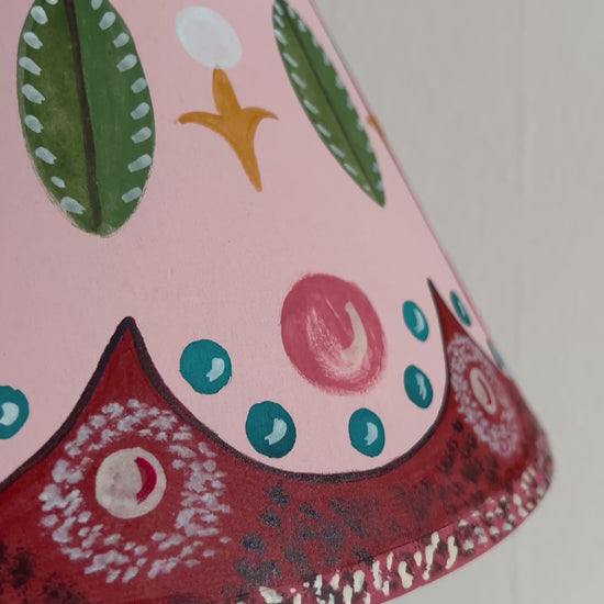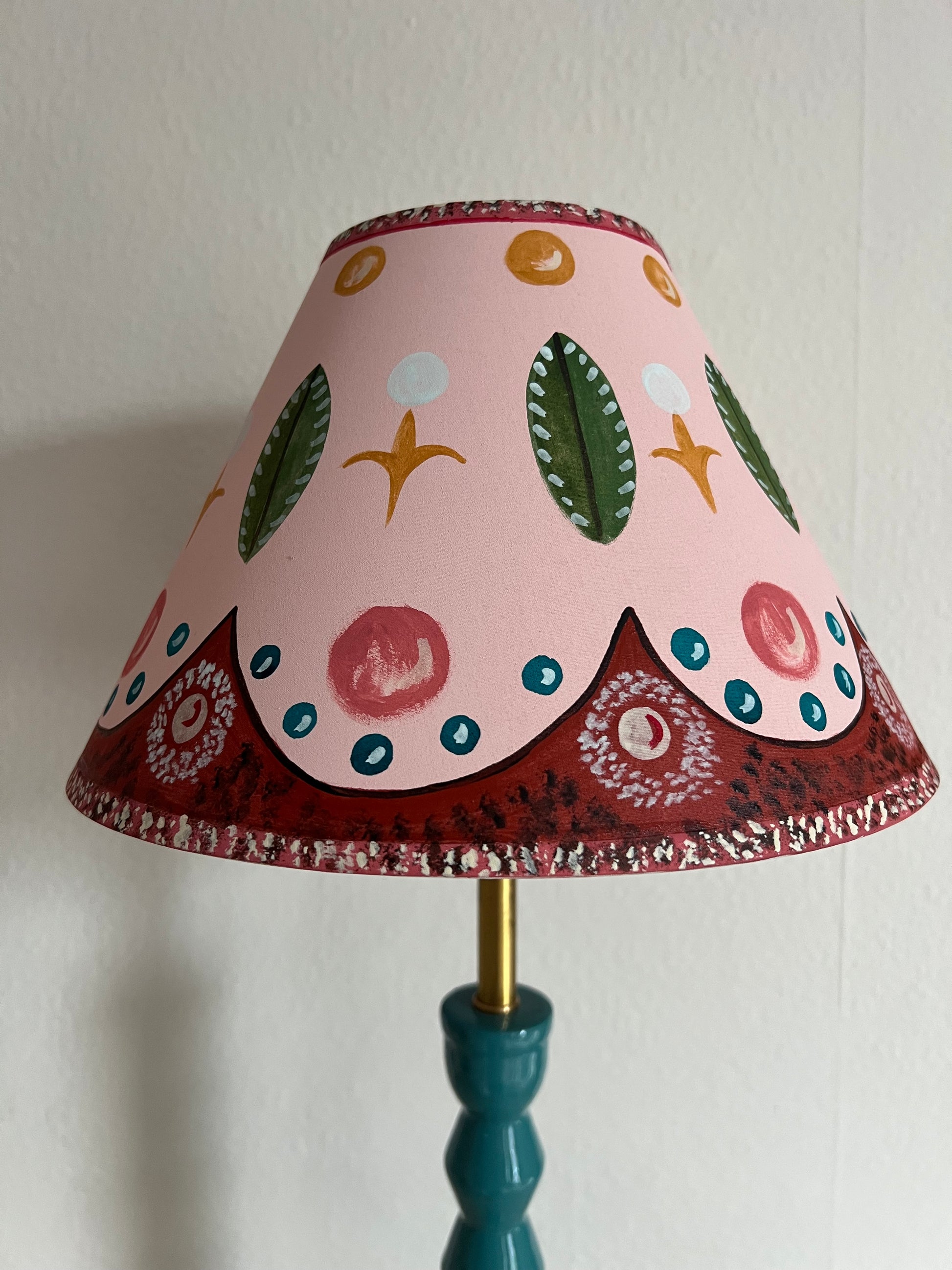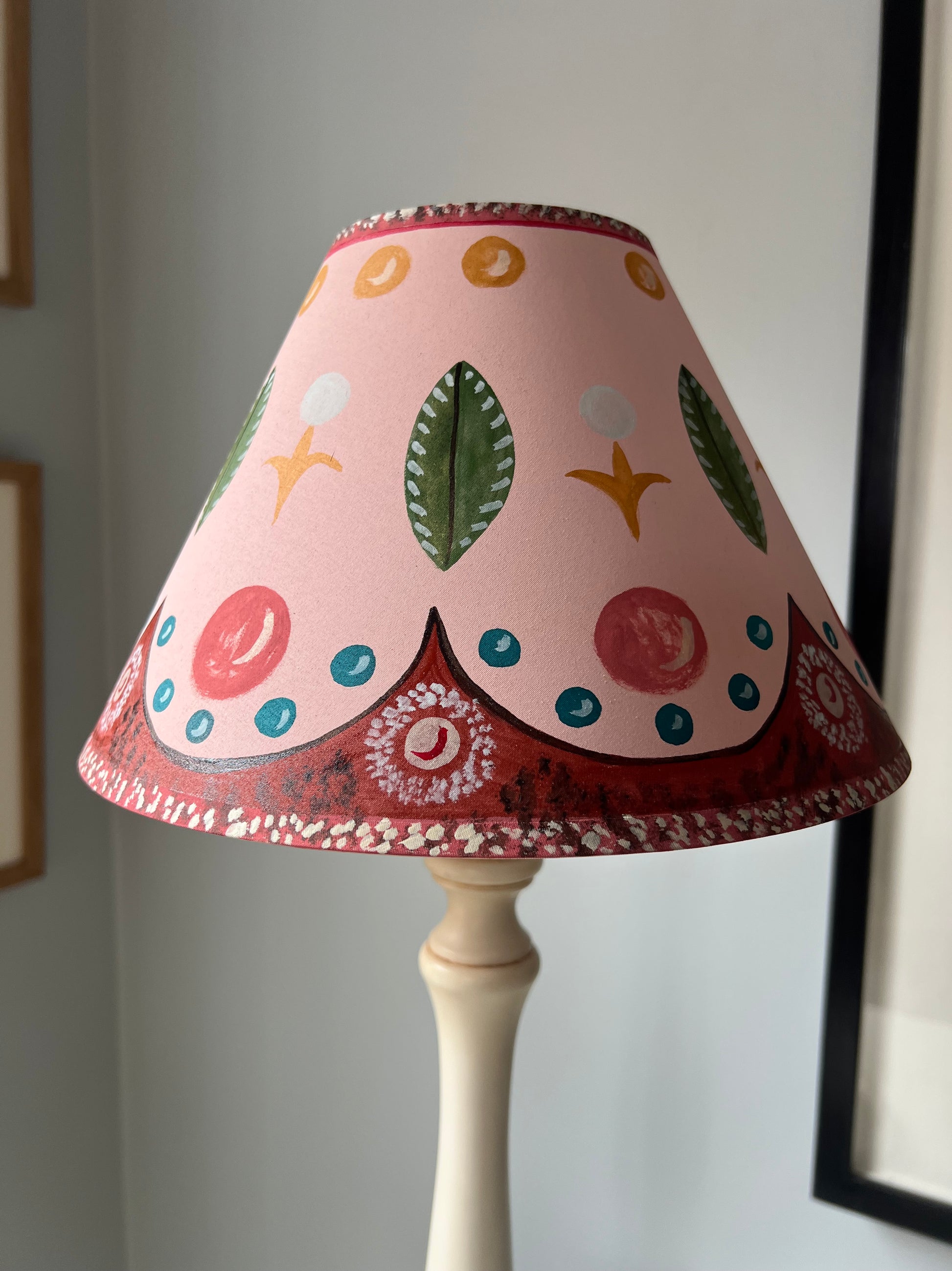 Celebrate colour and pattern with this joyful hand-painted lampshade painted by myself here in the UK. Inspired by folk art and traditional decorative motifs and with more than a nod to the beautiful interiors of Charleston, the beloved home of Bloomsbury Group artists Vanessa Bell and Duncan Grant, the design features playful scalloped edging in rich reds, with painterly dots, leaves, and star-like flourishes in earthy greens, pinks, and golds. Set against a soft blush pink background, the lampshade feels both nostalgic and contemporary, making it a unique statement piece for any interior.
