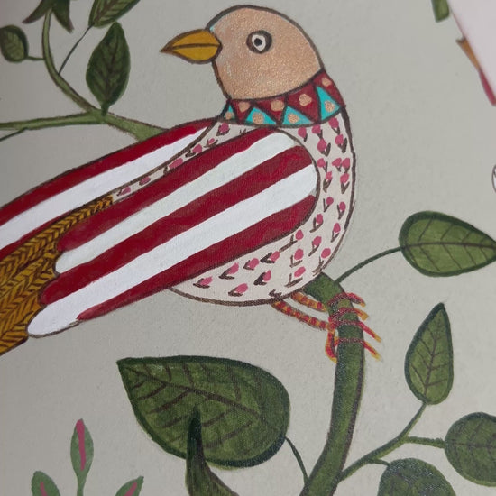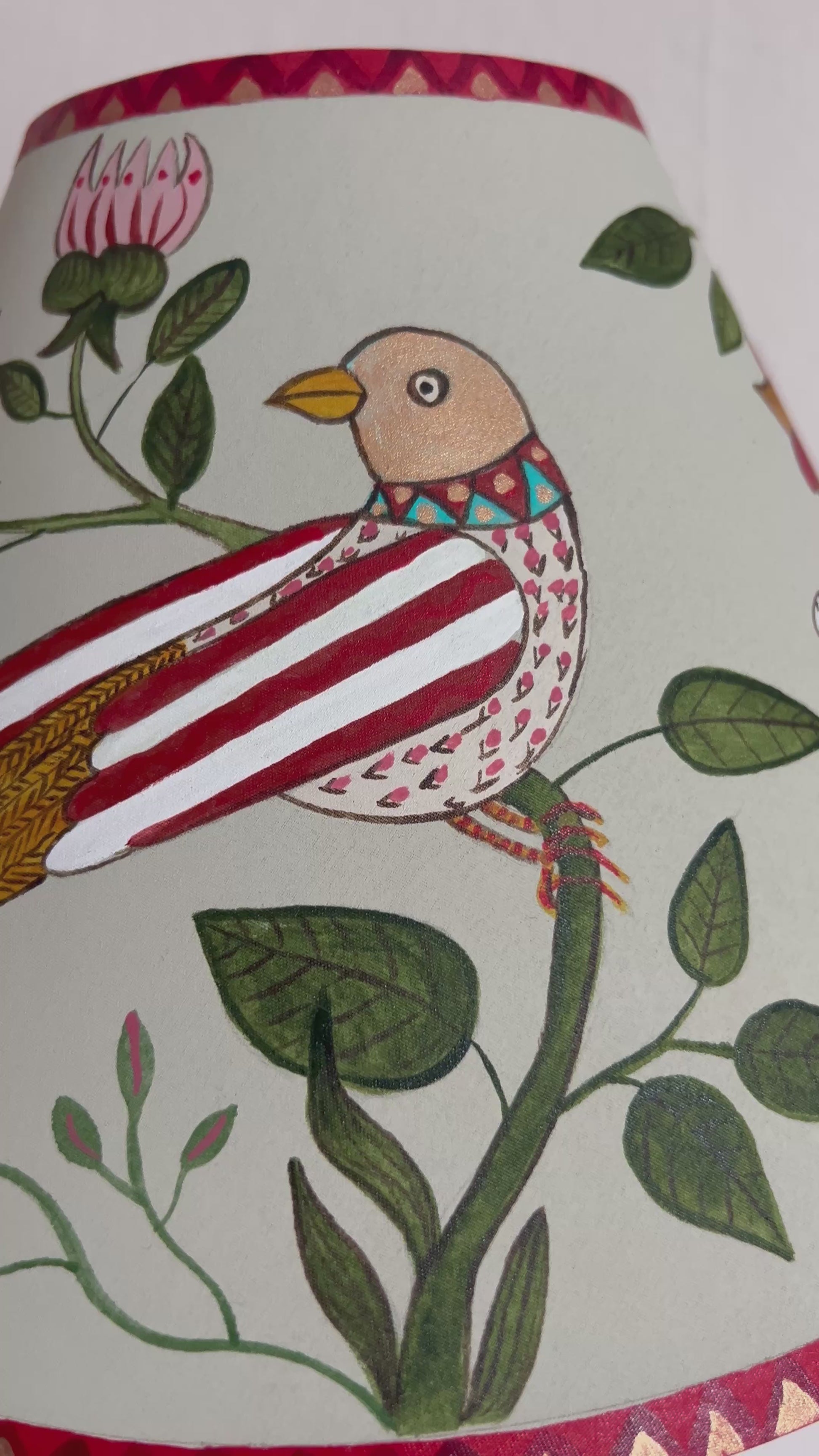 This hand-painted lampshade, painted by myself in the UK, brings nature indoors with its bold bird-and-flower design. A beautifully patterned bird perches among stylised leaves and blossoms, framed by a hand-painted border in warm reds and golds. The soft green background enhances the intricate details, giving the piece a timeless, decorative quality inspired by the Arts and Crafts movement.