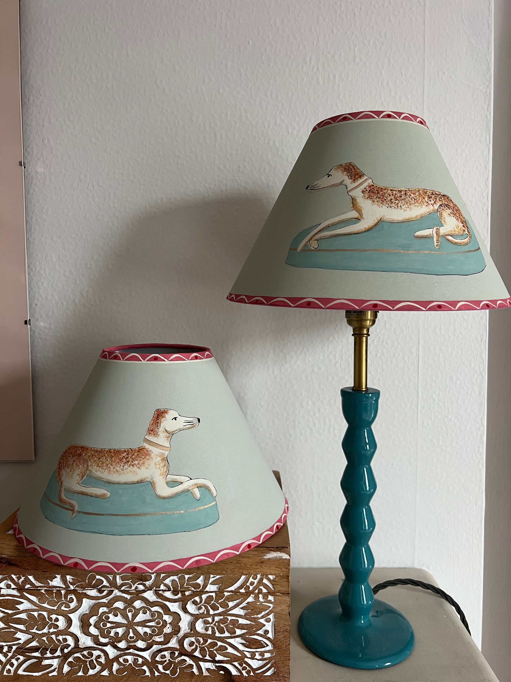 Original, hand painted lampshade with my own design (painted by yours truly). Each lampshade is a one-off. This lampshade is the latest in a series of shades I have painted featuring a Staffordshire figure of a greyhound - a recurring theme in my work as I am passionate about Staffordshire pottery!