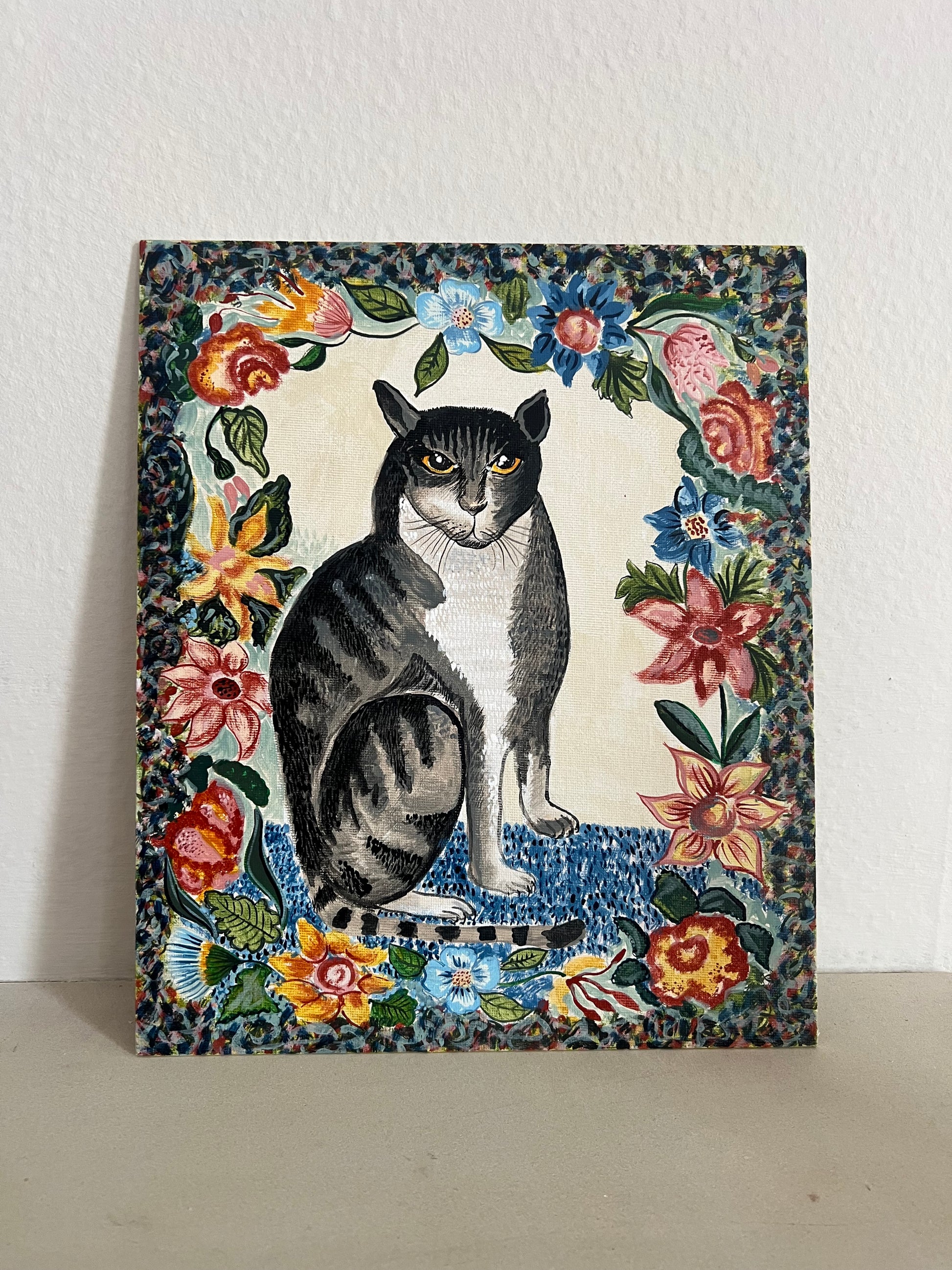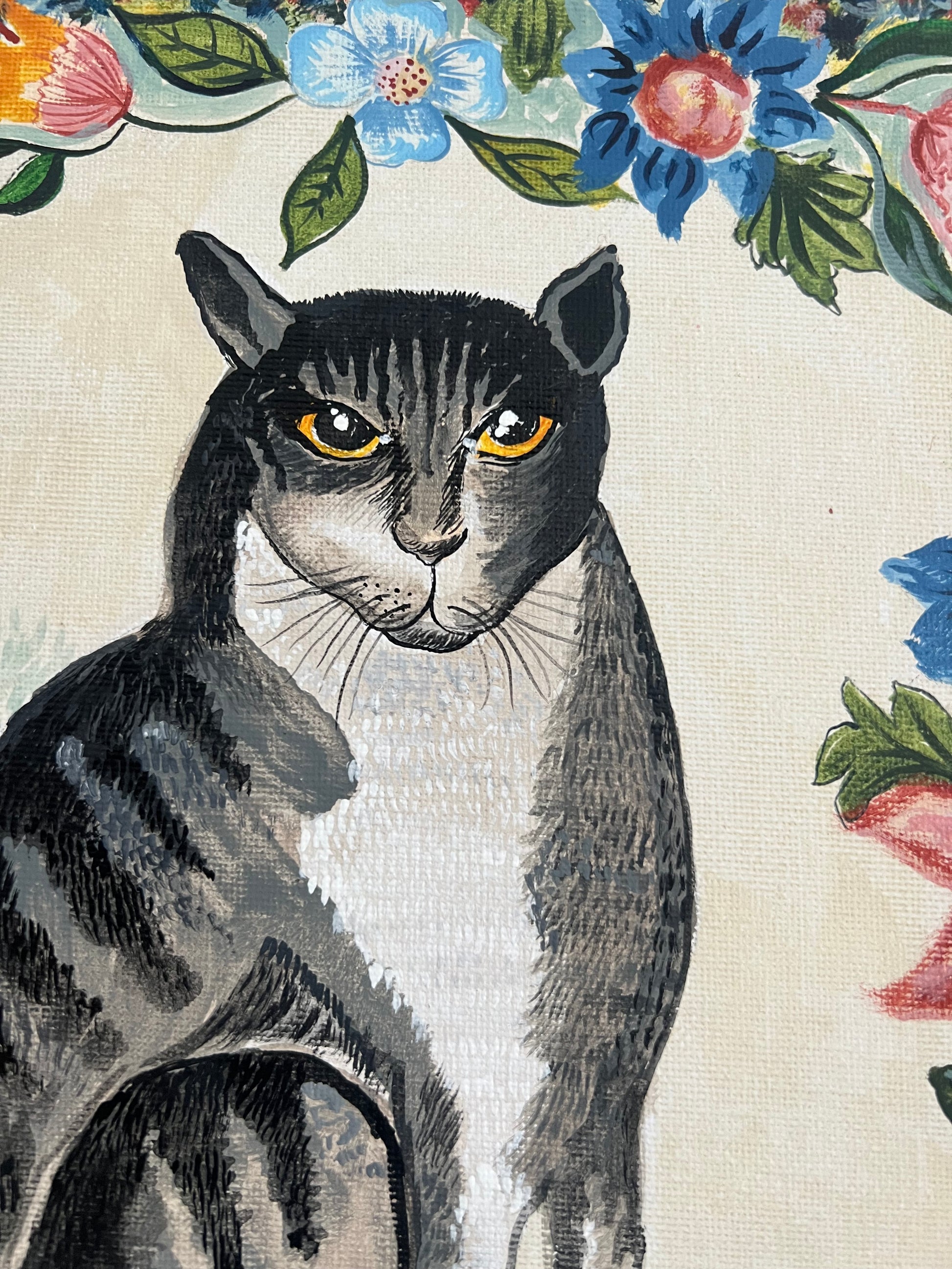 This original painting is inspired by my love of traditional folk art, where everyday subjects are celebrated with rich colour and decorative detail. Painted in acrylic on canvas board, it features a striking black-and-white cat framed by a vibrant border of hand-painted flowers. The combination of bold brushstrokes and intricate patterning gives it a timeless, storybook quality.