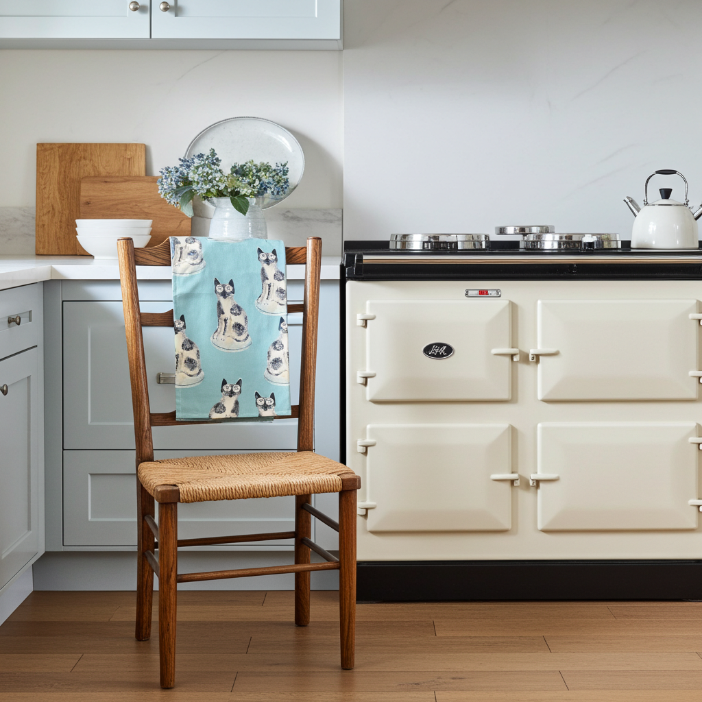 Bring a touch of vintage British charm into your kitchen with this Staffordshire Cat Tea Towel, featuring Melanie Lewis’s hand-painted design inspired by collectible 19th-century pottery figures.
