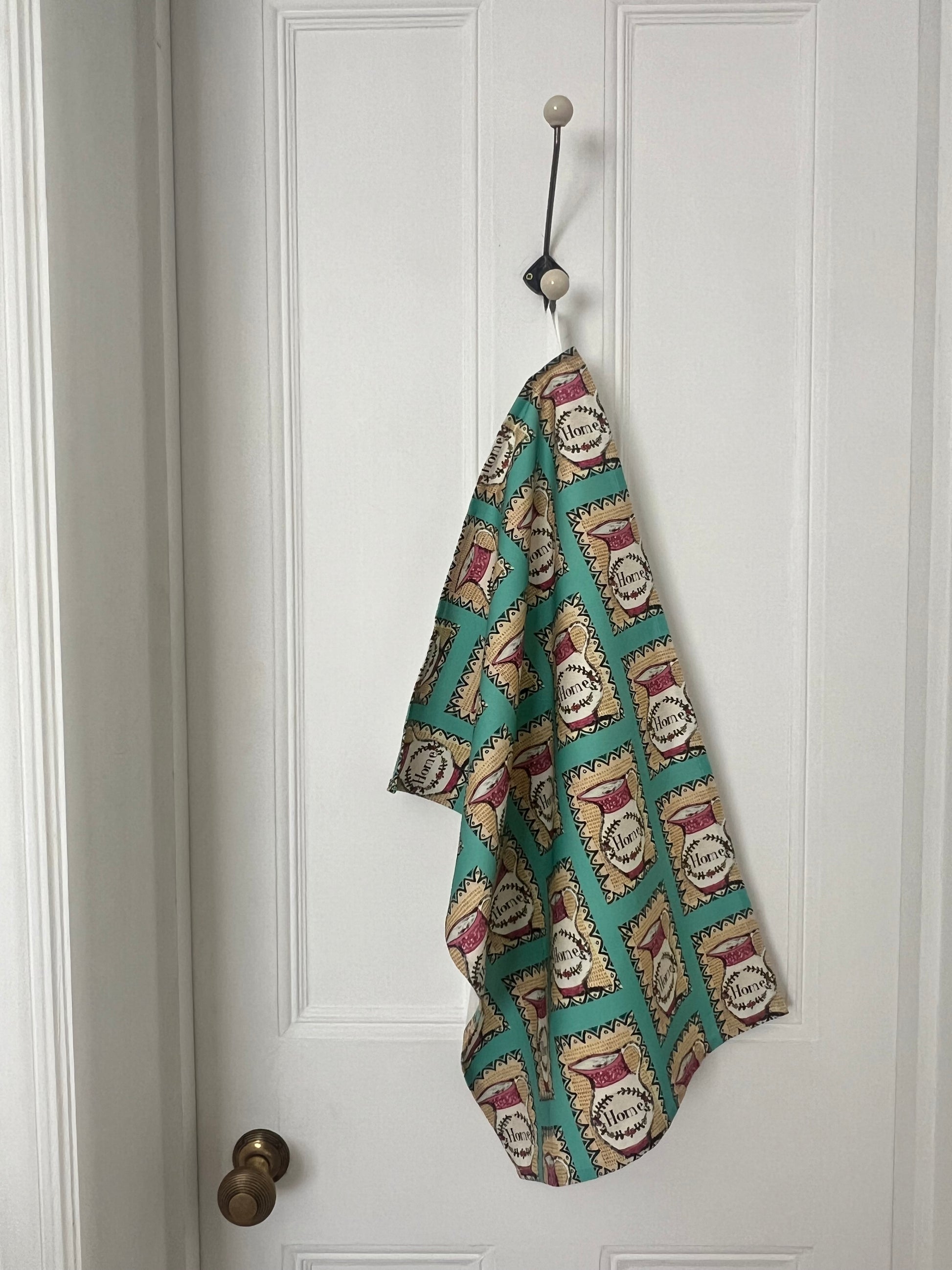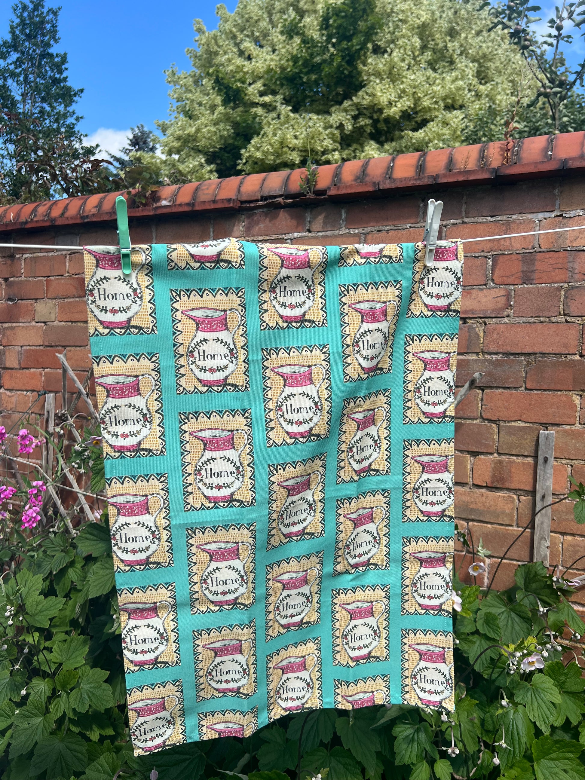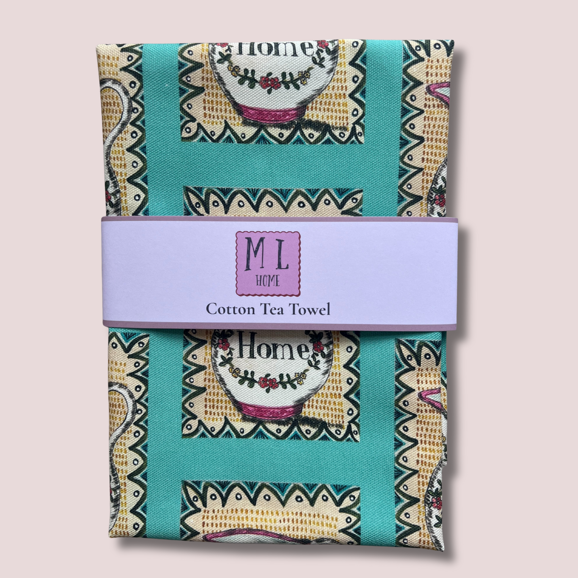 Add artisanal charm to your kitchen with this 100% cotton tea towel featuring a repeating design of my original painting of a Sussex lustreware jug, proudly inscribed with the word “Home.” Set against a rich teal background, it blends heritage pottery inspiration with bold, decorative style. Perfect for both traditional and modern interiors, it’s an ideal kitchen accessory, thoughtful gift, or collectible piece of homeware art.